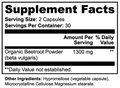 Ingredients: Organic Beetroot Powder (beta vulgaris) 1300mg, Hypromellose (vegetable capsule), Microcrystalline Cellulose, Magnesium Stearate.